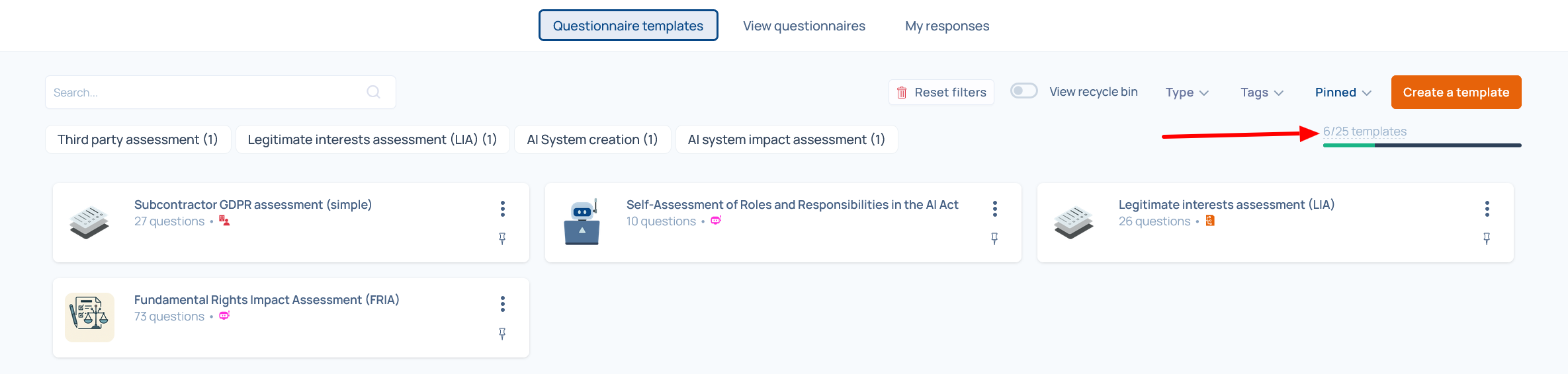The quota applies only to questionnaire templates created or used. It does not limit the number of invitations or responses to questionnaires.