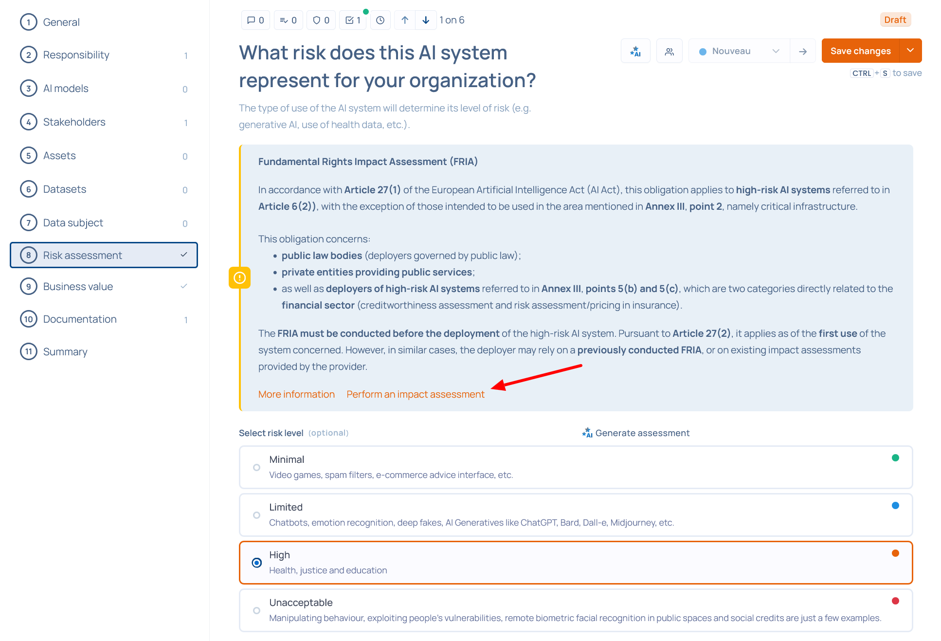 If you indicate you are the deployer of a high-risk AI system, an alert reminds you of the situations in which an impact assessment is mandatory and redirects you to a FRIA (Fundamental Rights Impact Assessment) questionnaire.