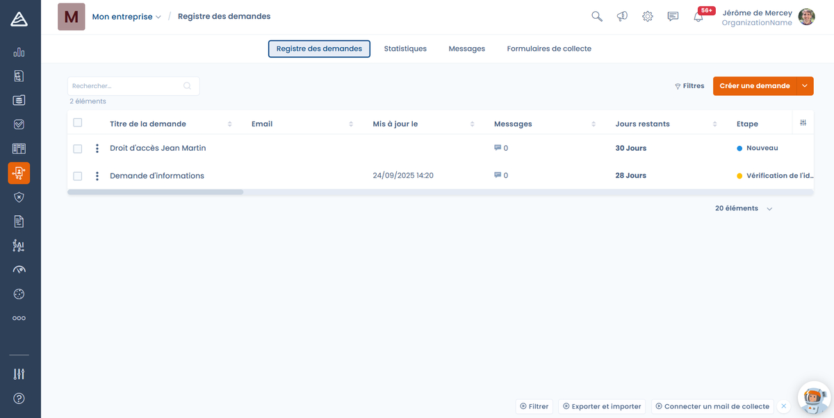 De manière générale, le logiciel permet de gérer le cycle complet d’une demande d’exercice de droits (DSAR) : qualification, vérification d’identité, traitement des données associées et réponse conforme au demandeur.