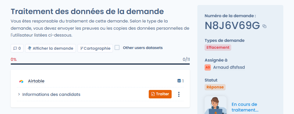 Désormais, l’interface est plus intuitive et garantit une meilleure séparation des responsabilités entre les personnes en charge de la gestion des demandes et celles responsables de leur mise en œuvre dans le système d’information.Grâce à cette nouvelle fonctionnalité, les responsables des actifs contenant les jeux de données relatifs à la personne concernée sont directement notifiés et disposent d’un lien sécurisé leur permettant de transmettre les données demandées, les preuves de suppression, ou tout autre élément requis pour le traitement de la demande.