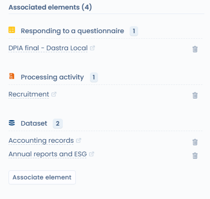 Associez vos tâches à plusieurs objets simultanément : traitements, actifs, contrats ou autres éléments. Il est également possible de lier des tâches à une réponse de questionnaire.