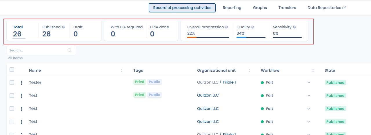 - Ajout de métriques relatives au registre des traitements en haut du tableau de gestion des traitements.