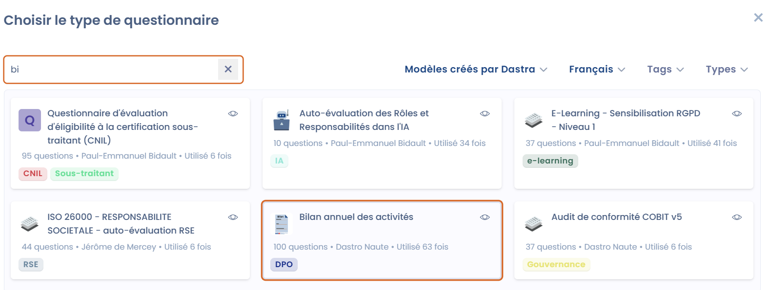 Dans la bibliothèque des modèles de questionnaires, utilisez la barre de recherche pour taper “Bilan annuel des activités” et sélectionnez le modèle.