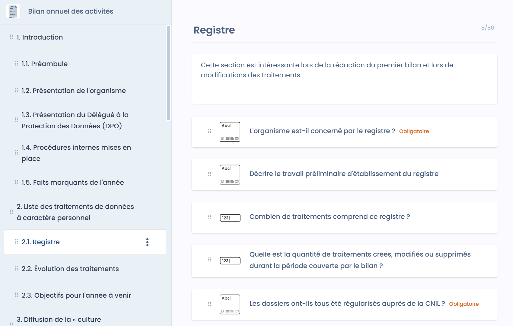 Grâce à ce questionnaire Dastra, vous êtes guidé pas à pas dans l’élaboration de votre bilan d’activité DPO. Les questions structurées vous aident à formaliser vos actions, vos constats et vos priorités, sans partir d’une page blanche.